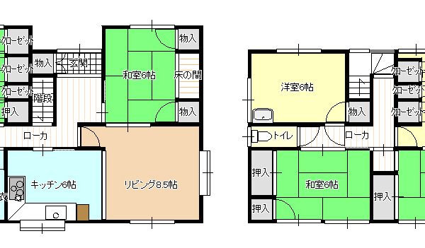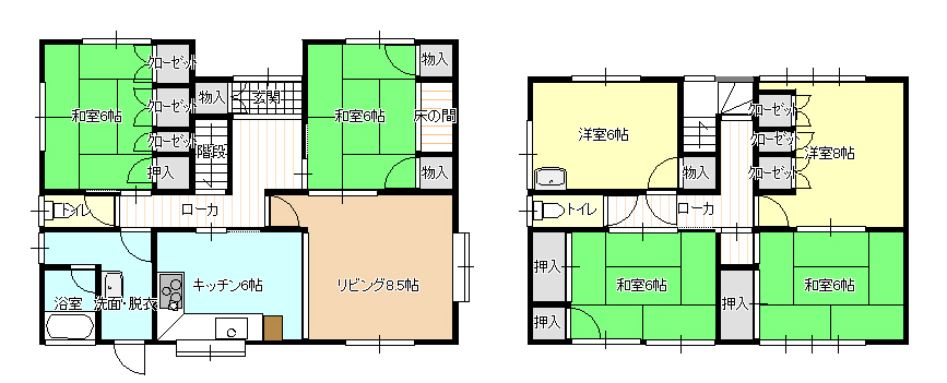 間取内容 DK6畳 1階 1室  L8.5畳 1階 1室  和室6畳 1階 2室  和室6畳 2階 2室  洋室8畳 2階 1室  洋室6畳 2階 1室
